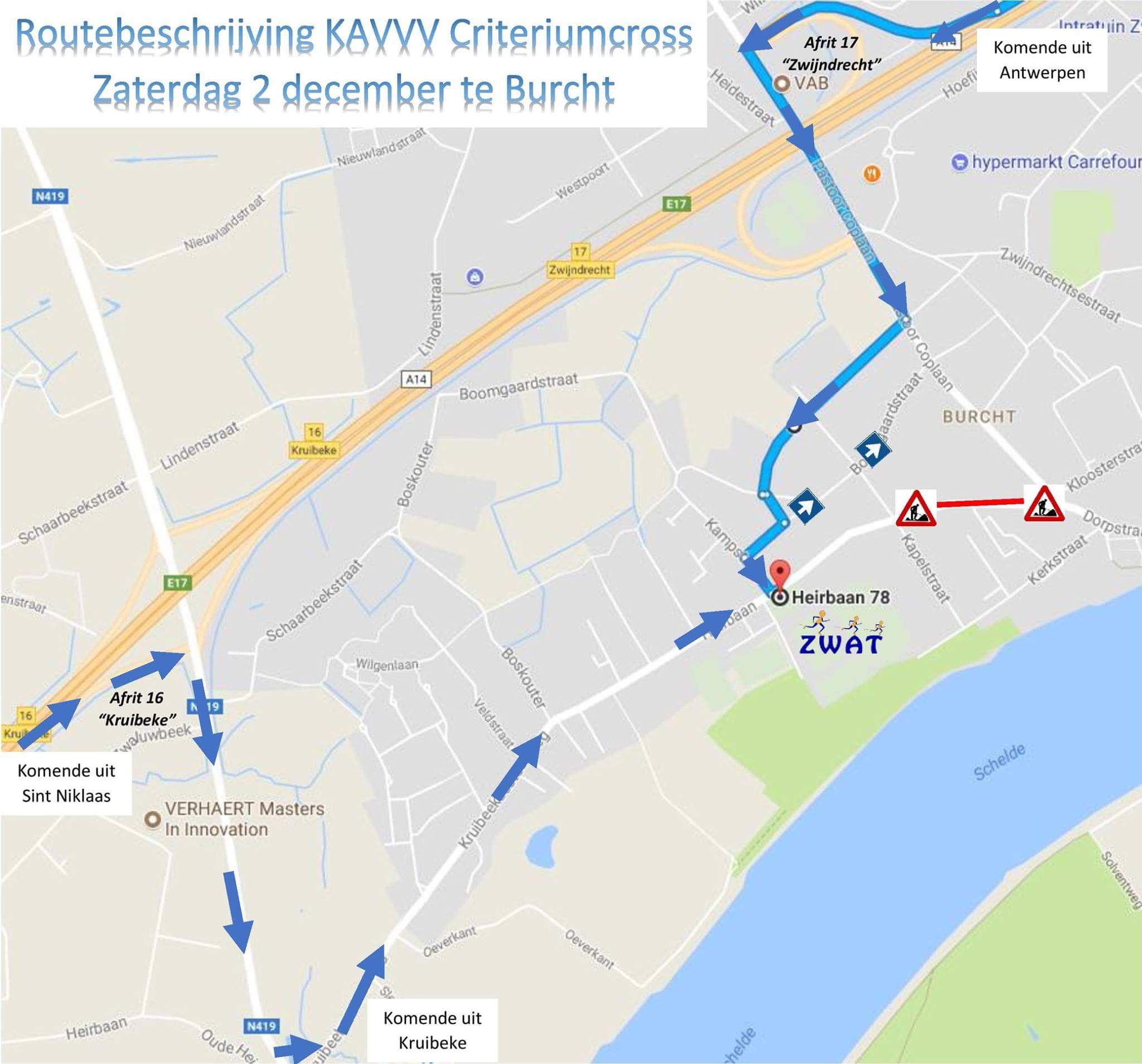 Komende uit Antwerpen kun je dus enkel via de Verbindingsstraat naar de cross komen. De Verbindingsstraat is de eerste straat rechts, na de op-/afritten van de E17! Van zodra je hier rijdt kun je de pijlen "Omleiding" volgen en kom je vanzelf op onze parking...